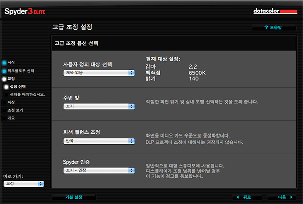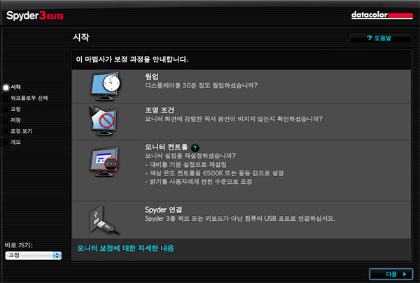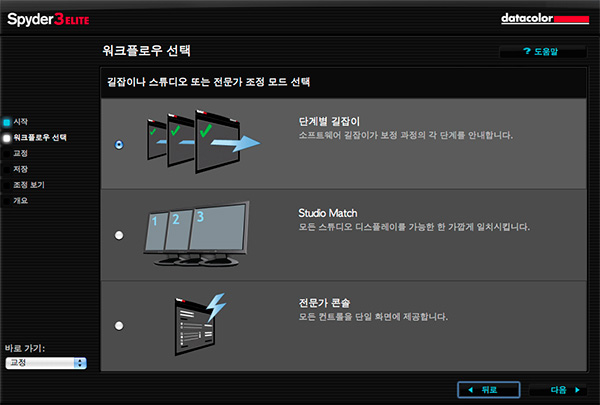 다음으로 워크플로우 선택을 하게 되는데 보통 이런 종류의 설정은 전문가 모드 혹은 Advanced Mode 로 하는게 편한 경우가 많지만 Spyder 3 Elite 4 버전에선 이런 만용을 부리기가 어렵습니다. 저도 처음 익숙해지는게 약간의 시간이 걸렸습니다. 때문에 그냥 속편하게 단계별 길잡이로 선택합시다.