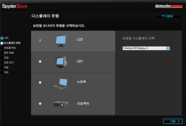 참고로 애플 시네마 디스플레이로 진행하였는데, 이유는 Elite 4 프로그램에서 하드웨어 백라이트를 조정 할 수 있는지 여부였습니다. 아무튼 자신이 캘리브레이션 하려는 모니터 유형에 따라 선택해주시면 되겠습니다.