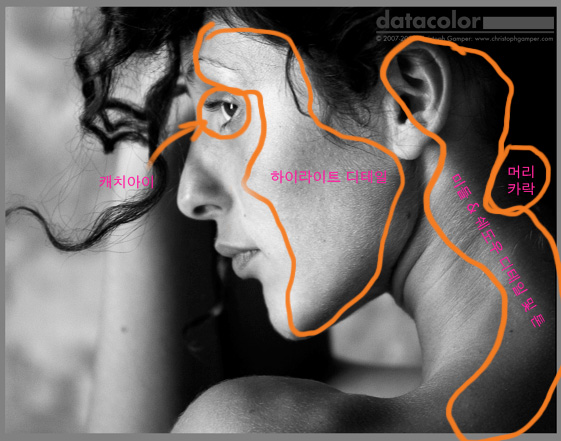 먼저 안구 옆 눈썹을 따라 뺨쪽을 흐르면서 피부톤의 하이라이트 디테일을 확인 합니다. 톤이 완전히 하얗게 나르거나 하진 않았겠죠? 안구의 캐치아이는 가장 밝은 흰색이여야 합니다. 그리고 전체적인 백색의 색깔을 확인하면서 뺨을 타고 목까지 시선을 옮겨봅니다. 이때 혹시 회색의 연속된 계조가 중간에 어색하게 느껴지진 않나요? 여기 까지 확인 했으면 제법 괜찮습니다. 그러나 마지막 난관이 기다리고 있습니다.