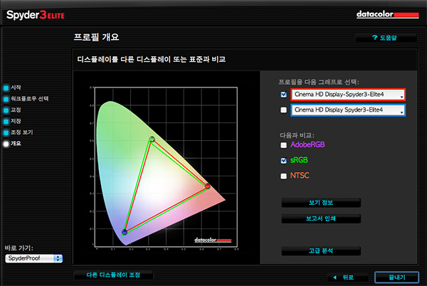 - Spyder 3 센서를 통한 ColorEyes Display Pro와 Elite 4 프로그램간의 비교.