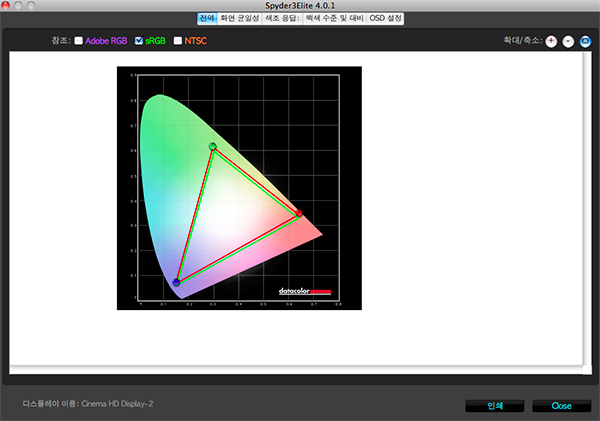 다 끝났으면 마지막 화면 입니다. 캘리브레이션 된 모니터의 컬러 게멋과 기준 게멋인 AdobeRGB 혹은 sRGB와 비교가 가능 합니다. 이번 캘리브레이션에 사용된 모니터는 애플 시네마 디스플레이 이므로 sRGB영역에 맞아야 합니다. 결과를 보면 제대로 된것을 확인 할 수 있습니다.