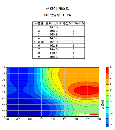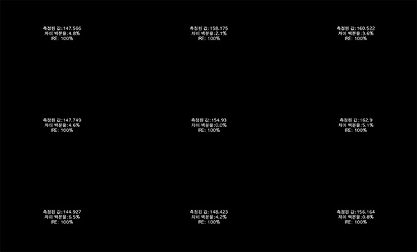 위와 같은 그래프가 밝기에 따라 4개를 만들며 100% 밝기 부터 50% 밝기까지 측정이 됩니다. 100% 밝기의 그래프를 보니 중심을 기준으로 최대 6%의 차이가 발생했습니다. 이 정도면 제법 괜찮은 수준이군요.