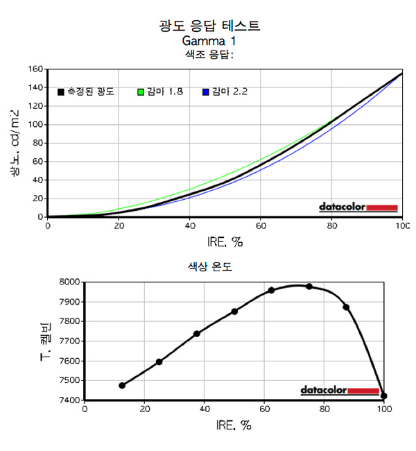 다음으로는 감마값과 밝기에 따른 색온도 측정 결과를 볼 수 있습니다. 그런데 좀 이상하죠? 분명 캘리브레이션이 되어 있음에도 제대로 반영이 안되어 보입니다. 그렇습니다. 지금까지의 분석 기반은 전부, 캘리브레이션 값은 무시후 측정이 된 것 입니다. 다시 말해 순수 패널 자채의 특성 측정한 것 입니다.