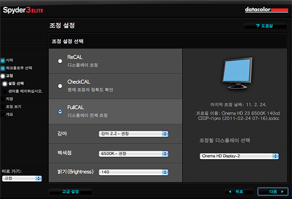 진행은 FullCAL 로 합니다. 그리고 감마는 2.2, 백색점 (화이트포인트)는 6500K, 밝기는 140cd로 합니다. 이것에 관한 이유는 앞서 작성한 i1 Display 2 리뷰를 참조 하여 주십시오. 그런데 잠깐! 여기서 바로 '다음' 버튼을 누르지 말고 '고급 설정' 을 누르도록 합시다.