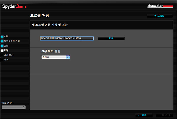 아무튼 캘리브레이션이 끝나고 나면 해당 프로파일 이름을 입력 해줘야 합니다. 저의 경우 모니터 이름, 센서 이름, 캘리브레이션 프로그램 이름 순으로 정하고 저장해주었습니다. 축하합니다. 랍니다. 글쎄요 아직 축하하기엔 이릅니다. 샴폐인을 성급하게 터트리면 안되죠. 이제 다음 버튼을 눌러 봅시다.