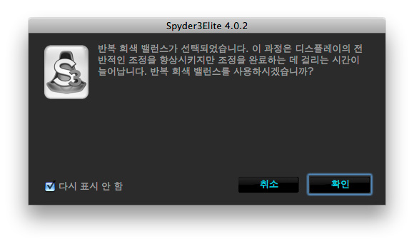 아무튼 그래서 모니터 설정을 여러가지로 바꾸어도 보고 어떻게든 그레이 스케일 선형성을 되돌려 받기 위해 노력을 했지만 (심지어 작업실 불 다 끄고 했습니다. 잡광 영향이 있을까봐) 여전히 결과는 신통찮습니다. 그런데 그때 의심스러운 메뉴를 접하게 됩니다. 왠지 직감적으로 '반복' 을 선택 하고 싶어졌습니다. 그랬더니 이렇게 겁을 주는군요.