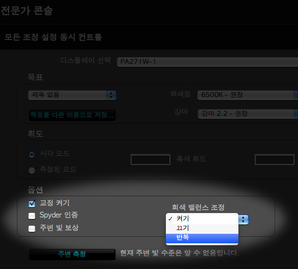 주변 빛 보정은 끄도록 합시다. 그리고 제일 중요한 부분. 바로 회색 밸런스 조정 입니다. 여기서 선택은 '반복' 옵션을 하도록 합니다. 나중에 후회하지 말고 꼭 하도록 합시다. 한번 더 강조 합니다. '반복'으로 선택 하십시오. 그리고 Spyder 인증도 그냥 끄기를 합시다.