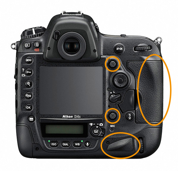 바디 뒷면을 볼때 D4와의 변경점이라고 한다면 이러한 바디의 무게 밸런싱에 보다 적극적으로 대응하기 위한 메모리 슬롯 커버를 겸하는 몰딩 디자인 변경에 의한 그립감 향상, 세로그립의 엄지 손가락 파지대 몰딩, 서브 멀티 셀렉터의 미끄럼 방지 몰딩 변경등이 있습니다. 전면 그립만이 아닌 후면 또한 그립감 향상을 위한 디자인 변경은 Nikon D4s 운용시 감각과 템포는 물론, 무거운 렌즈를 운용시에도 흐트러짐 없는 파지감을 주고 있습니다.