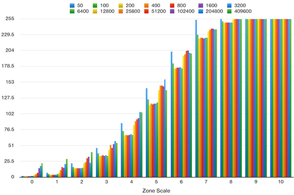 위의 차트를 통해 세가지를 주목해 볼만 합니다. 먼저 확장감도 Lo-1 감도인 50을 살펴봅시다. Zone 8번대에서 하이라이트가 소실되었습니다. 따라서 대단히 특수한 경우가 아니라면 감도 50을 사용하는 것 보다 감도 100 이상을 사용하는 것이 하이라이트 표현력에 더 많은 이득이 있습니다.