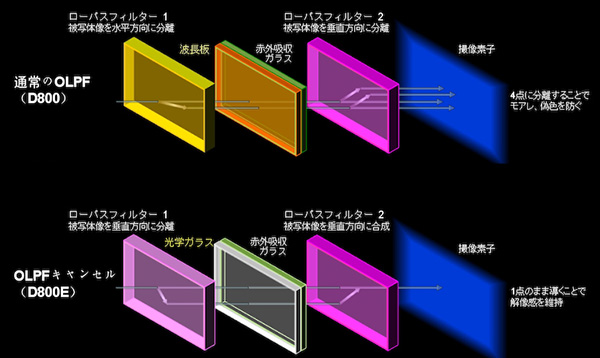 허나 D800E는 최고의 해상감을 위해 OLPF 캔슬러 개념을 도입하여 첫번째 OLPF에서 2개로 분리된 빛이 적외선 필터를 통과한 후 다시 두번째 OLPF필터에서 역상으로 다시 하나로 합치는 방식을 채택하고 있습니다. 따라서 결론적으로 OLPF가 없는 상태의 결과와 마찬가지 형태로 최종 화질이 만들어집니다.