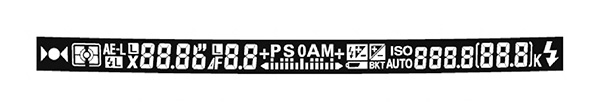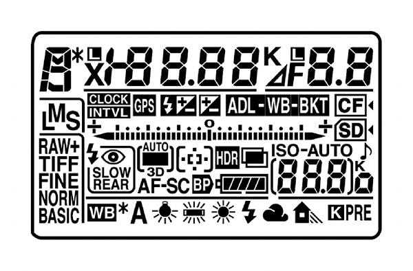 정보 LCD창에선 일반적인 DSLR에서 볼 수 있는 정보가 있습니다. 중요한 정보인 셔터 스피드와 F값은 숫자를 큼직하게 하여 시인성을 높이고 그 밖에 필요한 정보들은 관련 섹션을 나누어 정돈한 모습입니다.