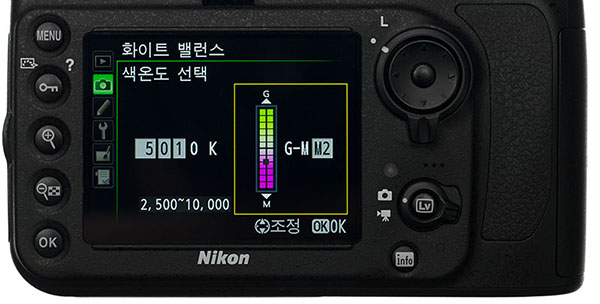 D800E에서 무척 반갑게 개선된 부분 중 하나가 바로 10K 단위로 색온도 설정이 가능하는 점인데 무척이나 반가운 부분 입니다. 그와 더불어 색온도를 말할때 따라오는 주광궤적곡선상의 틴트를 맞추는 부분까지도 커스텀 가능하므로 보다 적극적으로 화상의 색기준을 잡을 수 있습니다.