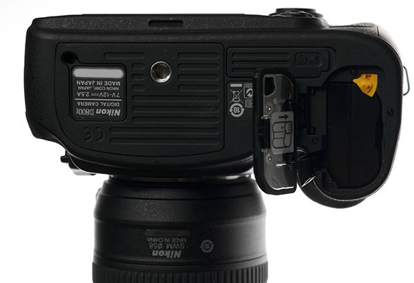 우측에는 메모리 삽입구가 마련 되어 있습니다. CF, SD 메모리를 사용 할 수 있으며 D800급 이전의 바디를 사용한 분들 중 상당수가 SD메모리를 사용하므로 이쪽 분들까지 포용 할 수 있는 설계가 된게 아닌가 하는 생각이 들었습니다. 물론 기록 메모리 슬롯을 지정 할 수도 있고 양쪽을 순차적으로 쓸 수도 있으며 백업 용도로도 사용 가능 하므로 듀얼 슬롯이 주는 장점을 자유롭게 활용 가능 합니다.