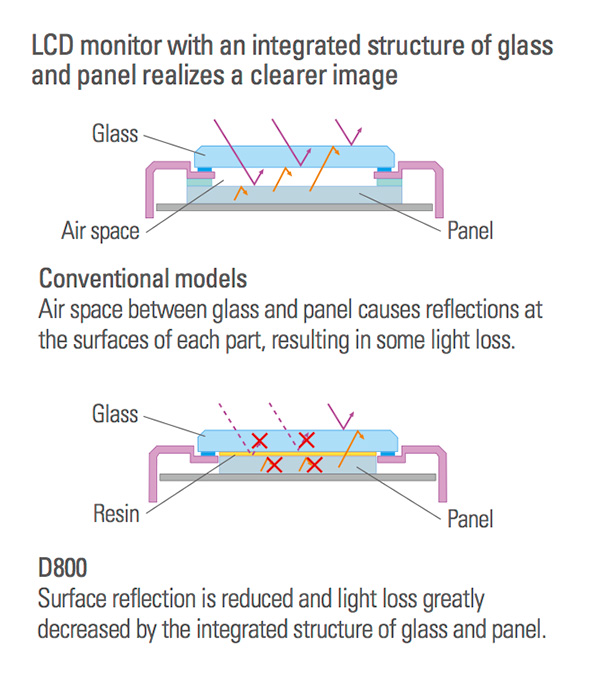 기존에는 LCD패널과 글래스 사이의 공간이 있어서 난반사가 사실 많이 일어났다면, D800 시리즈의 경우 그 사이 공간을 없애버리고 고순도 투명 수지로 아에 접합을 시켜버렸더군요. 이러한 방법을 통해서 얻을 수 있는 장점은 크게 두가지가 있습니다. 첫번째로 위의 사진에서 보듯 난반사가 억제되어 매우 깨끗한 화면을 얻을 수 있습니다.