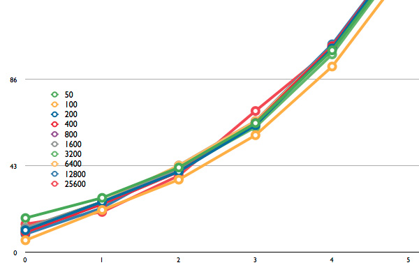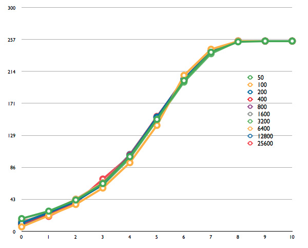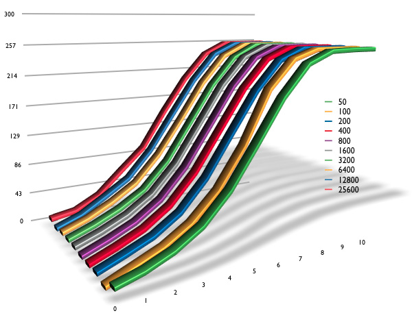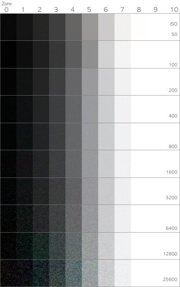 그래서 준비 했습니다. 각 감도별 노이즈 상황으로 ISO 50부터 ISO 25,600까지 감도별 데이터를 추출 하였습니다. 데어터 추출 환경은 다음과 같습니다. Zone VI Studio의 그레이 카드를 촬영, AF-S 105mm Micro f/2.8 VR 렌즈, 순수한 톤만 추출하기 위하여 초점은 무한대, 맑은 날 Open Shadow 환경, RAW로 촬영, Apple Aperture 3로 현상, Zone 0부터 Zone 10까지 총 11스톱으로 각 1스텝 단위로 촬영, 1:1 픽셀로 리사이즈 하지 않은 순수 데이터 입니다. 참고로 Zone 5의 밝기는 노출계에서 0의 위치, 즉 적정밝기라고 판단하는 그 밝기 입니다.