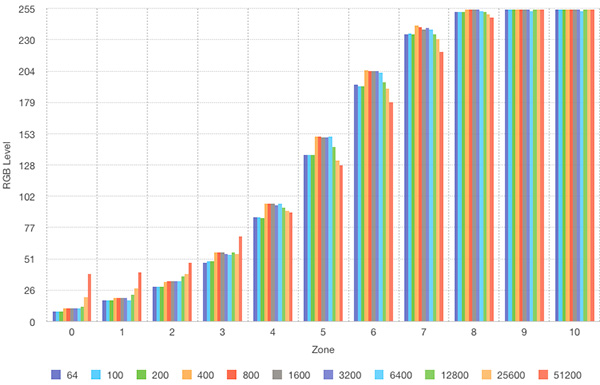 이제껏 Nikon DSLR과 다르게 감마값이 무척 안정적으로 그리고 제대로 잡혀있다고 볼 수 있습니다. 또한 전영역을 통틀어 가장 효율이 좋은 감도는 64, 100, 200이라 할 수 있습니다. 전체적인 성향을 한눈에 볼 수 있도록 약간 다르게 보도록 할까요.