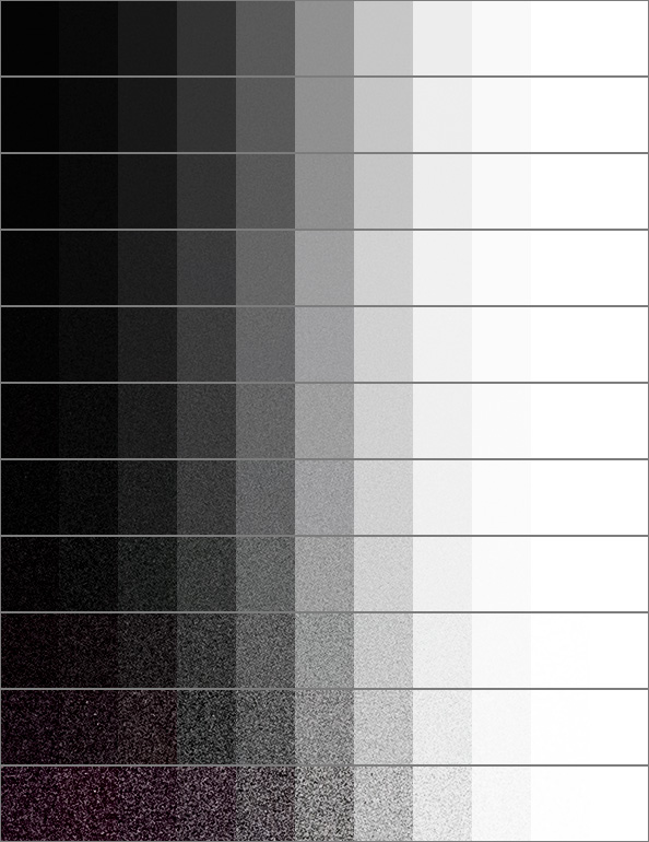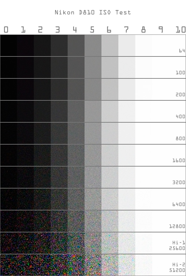 ISO 64 감도부터 51,200까지 감도별 데이터를 추출 하였습니다. 데이터 추출 환경은 다음과 같습니다. Zone VI Studio의 그레이 카드 촬영, AF-S 105mm Micro F/2.8 VR 렌즈, 오직 순수 톤만 추출하기 위하여 초점은 무한대, 맑은 날 Open Shadow환경, Zone 0 부터 Zone 10까지 총 11스톱으로 각 1스톱 단위 촬영, 리사이즈 하지 않은 1 : 1 픽셀의 순수 데이터 입니다. 참고로 Zone 5의 밝기는 노출계에서 0의 위치, 즉 적정밝기 (중간 회색) 이라고 알려주는 밝기 입니다.