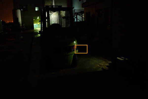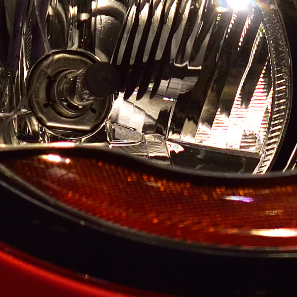 헤드라이트에 포커싱을 하여 촬영 합니다. 처음엔 헤드라이트 벌브에 포커싱 맞춰 촬영. 위의 사각형을 1 : 1 픽셀 매칭 (100% 확대) 한 것이 아래의 결과 입니다.