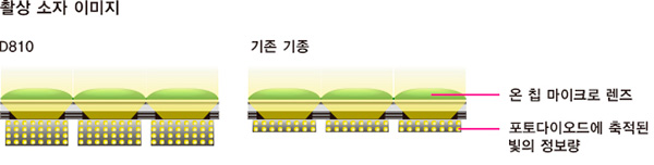 D810을 위한 새로운 신설계 센서를 탑재하였습니다. 전작 D800는 광학 로우 패스 (OLPF) 탑재 모델, D800E는 OLPF 캔슬러를 탑재 시키는 2가지 모델이 있었다고 한다면 D810은 애초 OLPF 자체를 삭제한 단일 모델만 있습니다.