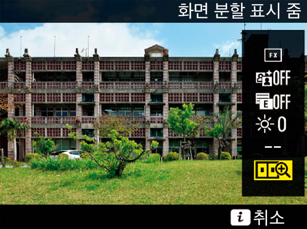 여기에 D810에서 또 하나 추가된 기능으로 '화면 분할 표시 줌' 이라는 기능이 신설 되었습니다. 이름만 들어선 무슨 뜻인지 쉽게 짐작하긴 어려울지도 모르겠습니다만, 내용은 신선합니다. 건축, 복사 촬영, 스틸 라이프 등의 사진을 촬영할때 매우 편리한 기능입니다.