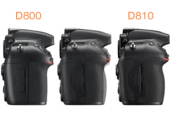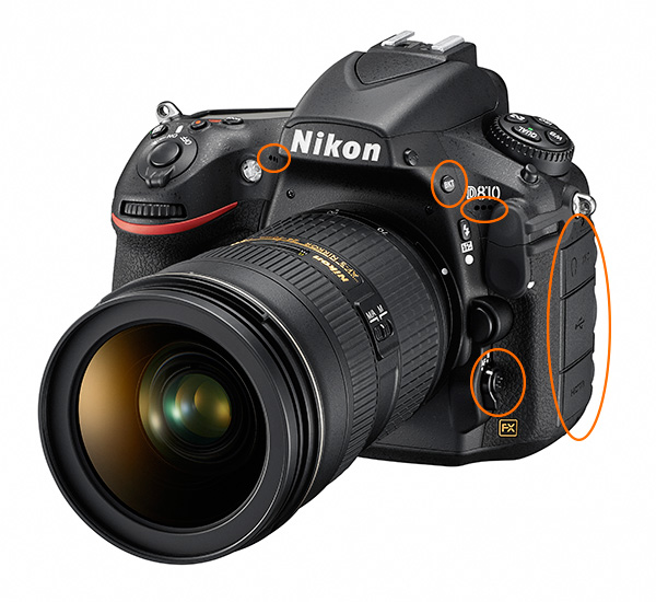 먼저 인터페이스 계통에 있어서 변화가 있습니다. 브라케팅 버튼은 플래시 노출 보정 버튼 위로 이동하였고 영상 촬영용 마이크는 스테레오로 업그레이드 되었습니다. 또한 좌측의 각종 연결 터미널 커버는 전작 D800의 One Door 타입으로 D800에서는 원가 절감을 위한 피눈물 나는 노력을 증명하는 부분 중 하나 였는데, D810에서는 단자별 분할 타입으로 더 좋아졌습니다. 또한 AF 셀렉터의 버튼은 미끄럼 방지 몰드가 추가 되었습니다.