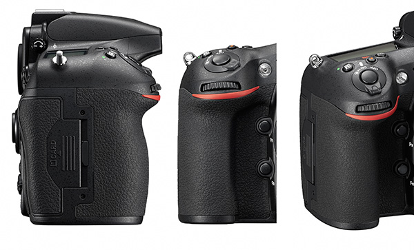 D800은 최대한 직선과 직각을 사용한 디자인이 기본으로 되어 있습니다. 심지어 그립을 위한 고무 재질도 직각을 유지하고 있지요. 전면 그립의 몰드 또한 최대한 직선에 가깝도록 되어 있습니다. D810과 비교하면 홀쭉하게 보일 정도지요.