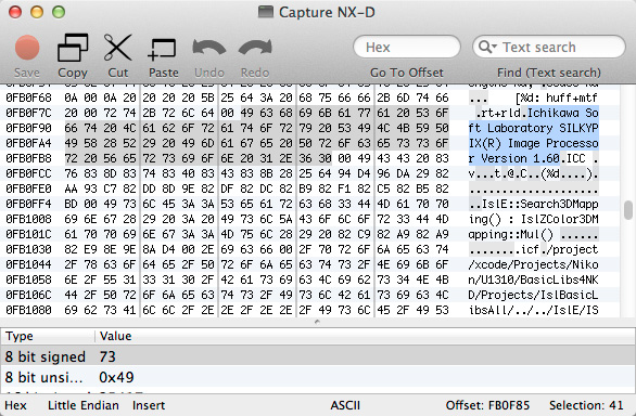 실제로 Capture NX-D의 특정 내부 바이너리를 열어 보면, 일본의 소프트웨어 제조사인 'ICHIKAWA SOFT LABORATORY'의 SILKYPIX라는 RAW현상 프로그램을 베이스로 한 Nikon 커스텀 버전이라는 것을 알 수 있습니다.