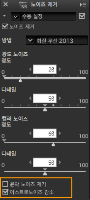 엄밀하고 정확해야 하는 천체 과학용까지는 아니더라도, 아스트로 노이즈가 발생하는 일생적인 상황에서, Capture NX-D의 노이즈 처리 항목에 아스트로 노이즈 제거 항목을 켜면 바로 손쉽게 없어집니다.