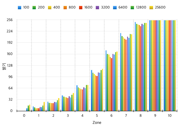 기왕 이렇게 본거, 각 감도별 데이터를 보는 것도 좋겠습니다. ISO 100 부터 25,600까지 감도별 데이터를 추출 하였습니다. 데이터 추출 환경은 다음과 같습니다. Zone VI Studio의 그레이 카드 촬영, Carl Zeiss FE 55mm Sonnar f1.8 렌즈, 오직 순수 톤만 추출하기 위하여 초점은 무한대, 맑은 날 Open Shadow환경, Zone 0 부터 Zone 10까지 총 11스톱으로 각 1스톱 단위 촬영, 리사이즈 하지 않은 1 : 1 픽셀의 순수 데이터 입니다. 참고로 Zone 5의 밝기는 노출계에서 0의 위치, 즉 적정밝기 (중간 회색) 이라고 알려주는 밝기 입니다.