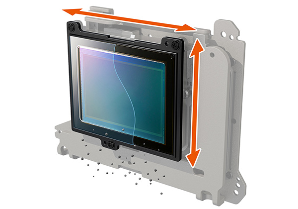 또한 최대 4.5단의 손떨림 보정 효과를 실현하기 위해 흔들림을 감지하는 센서의 배치도 무척 고심 하였습니다. 매우 민감한 센서이므로 셔터 릴리즈시 진동을 받지 않으며 전기 노이즈 또한 적어야 하고 또한 외부 충격으로 센서를 보호 할 수 있는 장소여야만 합니다. 이러한 기준에서 최종적으로 그립 뒷면에 각도, 쉬프트, 회전 검출 3개의 센서를 설치 하였습니다.