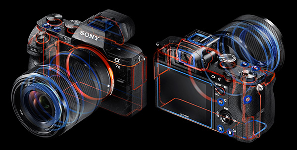 문제는 센서 구동식 손떨림 방지 입장에서 사이즈가 큰 풀 프레임 센서를 움직이게 하기 위해선 우측 및 하단에 동력 부분이 대형화가 되야 하고 떨림을 감지하는 센서 또한 동시에 탑재 해야 했기에 최초 개발시 a7의 크기는 매우 적합하지 않았다고 합니다. 따라서 이것을 어떻게든 우겨 넣어야 하는 시점에서 초대 a7과는 달리 내부 부품 배치를 완전히 변경 할 수 밖에 없었습니다.