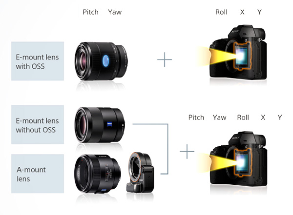 참고로 E 마운트 전용 렌즈의 경우 자동으로 초점거리와 초점을 맞춘 곳의 거리 정보를 가미한 손떨림 방지의 알고리즘을 적용 합니다. 만약 손떨림 보정 장치가 되어 있는 렌즈와 함께 사용 할 경우 Yaw, Pitch는 렌즈 측에서 보정하고 Roll, X, Y는 바디에서 교정하는 방식으로 됩니다.
