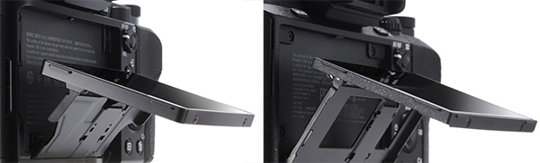 이러한 여러가지 개선 속에서 두께 증가를 억제 하기 위한, 후면 디스플레이 또한 얇게 만들어질 필요가 있었습니다. 얇아진 디스플레이의 공간 만큼 손떨림 보정 장치를 넣을 공각이 더 확보가 되기 때문 입니다. 좌측이 초대 a7, 우측이 a7 II 입니다. 확연히 얇아진 LCD 두께 입니다.
