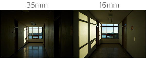 위의 샘플 두장은 같은 장소에서 몇 초의 시간차로 찍은 사진입니다. 다시 말해 태양의 위치 변화 없이 빛이 들어오는 위치가 같다는 뜻입니다. 먼저 35mm로 찍은 왼쪽 사진의 경우, 제가 처음 눈으로 봤을 때의 느낌을 그대로 살려 촬영한 것입니다. 물론 이것대로 나쁘진 않지만 빛이 만들어낸 패턴을 조금 더 강조하고 싶어 졌습니다.