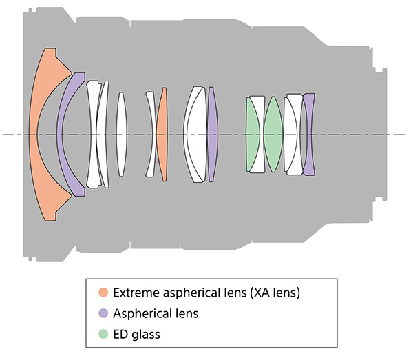 렌즈 구성은 비구면 렌즈 3매, 극초단파 비구면 렌즈 (XA Lens) 2매, 저분산 ED 렌즈 2매를 사용한 13군 16매로 화려한 구성을 하고 있습니다.