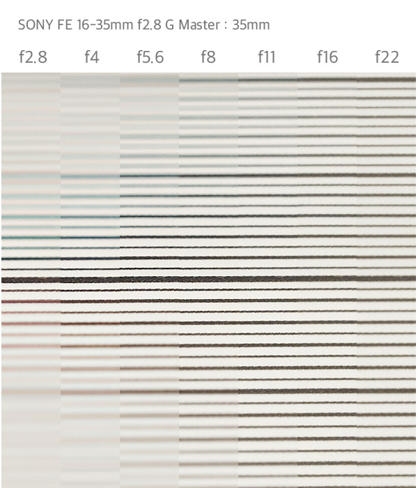 35mm 구간에서도 축상 색수차 억제력은 여전히 뛰어나며 28mm 구간과 마찬가지로 조리개를 단지 한 스톱만 조여도 해상력과 콘트라스트 성능치가 최대로 올라오기 시작합니다.