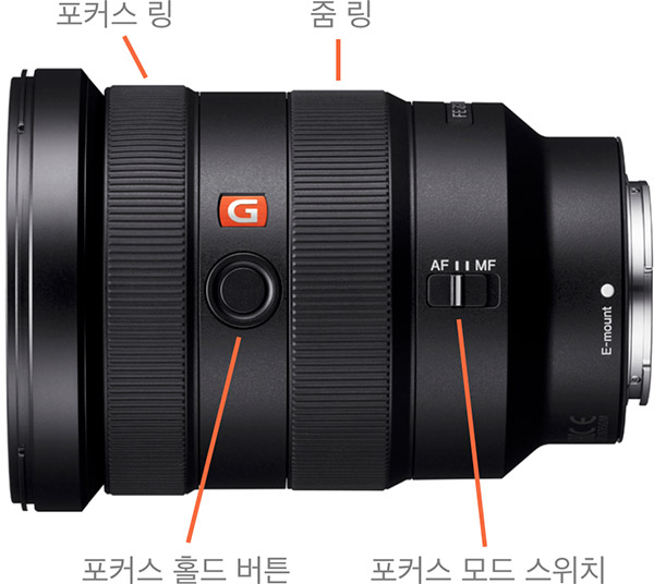 줌, 포커스 링 사이에는 SONY 렌즈의 최상위 라인업을 상징하는 오렌지 G 로고의 디자인의 악센트를 부여하고 있습니다.