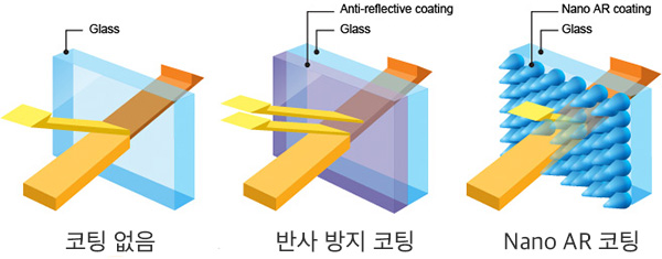 만약 렌즈 코팅이 없는 경우 공기와 렌즈의 경계에서 굴절률 변화 때문에 급격한 반사를 일으킵니다. 콘트라스트의 저하는 물론 심한 경우엔 해상력이 떨어질 수밖에 없습니다. 따라서 반사 방지 코팅을 하게 되는데 이것이 종례의 일반적 코팅이라 하겠습니다. 다시 말해 코팅이 완충 역할을 하여 굴절률 변화가 완만해지고 반사가 작아집니다.