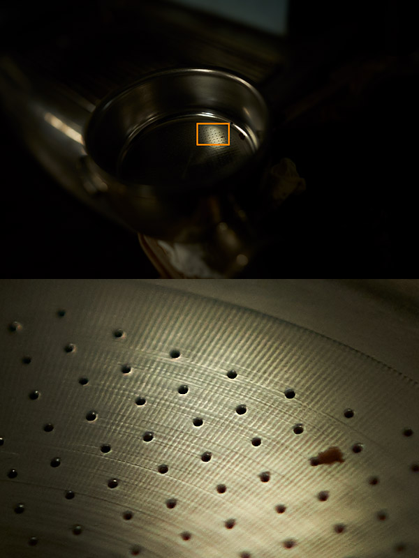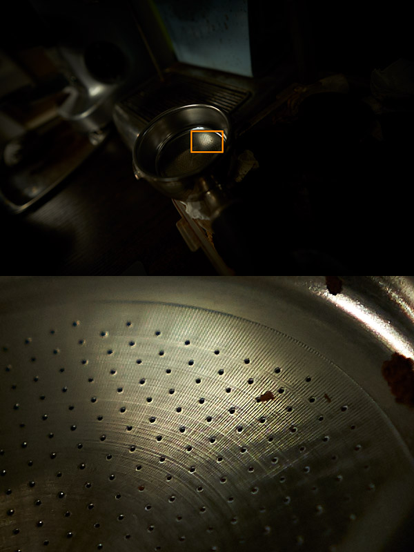위의 샘플은 에스프레소 머신의 포타 필터 바스켓을 SONY FE 16-35mm f/2.8 GM 렌즈의 최대 광각인 16mm에 최대 개방인 f/2.8에 설정하였고, 렌즈 화질 테스트에 있어서 가장 가혹한 구간인 최단 거리 초점 (0.28m)으로 촬영한 것입니다.