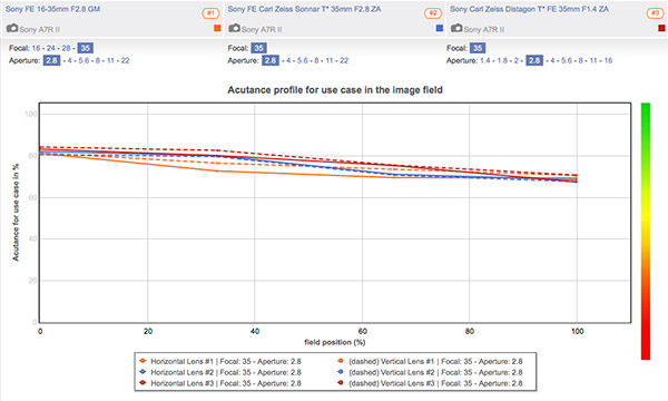 조금 더 구체적으로 보자면 FE 마운트에서 35mm 영역을 담당하는 SONY FE Carl Zeiss Sonnar T* 35mm F2.8 ZA 단렌즈 최대 개방과 SONY Carl Zeiss Distagon T* FE 35mm F1.4 ZA 단렌즈에서 조리개를 2단 조여준 f/2.8로 설정한 비교에서 조차 거의 동등한 해상력을 가지고 있습니다.